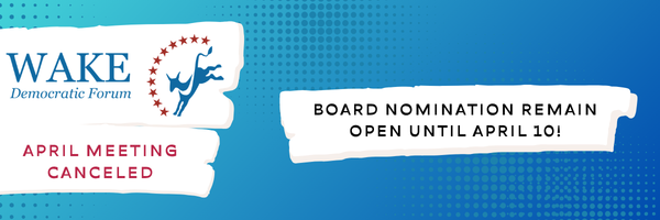 We are sorry to share that the Wake Democratic Forum will not hold its regular April meeting on April 2 this year.